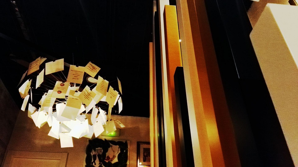 un detalle que gusta mucho es la lámpara inspirada en el gran Ingo Maurer, llena de notas con mensajes de amor, desamor, de la vida, graciosas…