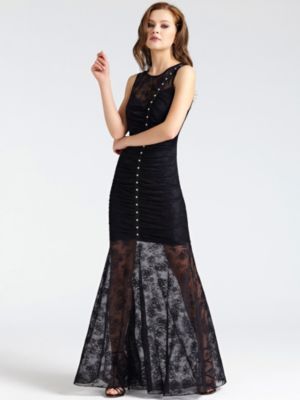 Este vestido, aparte de impresionante y sensual gracias al detalle de apertura lateral que incluye, es la opción ideal para eventos de noche en negro cuando queremos realmente causar sensación con un vestido largo que insinúa sin enseñar gracias al encaje y que aporta un punto de sensualidad gracias a un forro interior coronado por un cierre frontal abotonado.